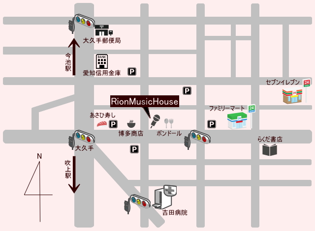 周辺地図 RionMusicHouse 〒464-0851 名古屋市千種区今池南31-21 クリエイティブ21 3F TEL.052-734-9094 アクセス 電車の場合 ※地下鉄東山線今池駅から 今池駅8番出口より南へ500m、大久手の交差点を東へ100m ※地下鉄桜通線吹上駅から 吹上駅1番出口より北へ300m、大久手の交差点を東へ100m 自動車の場合 駐車場は完備しておりませんので、スタジオ周辺のコインパーキングをご利用ください。